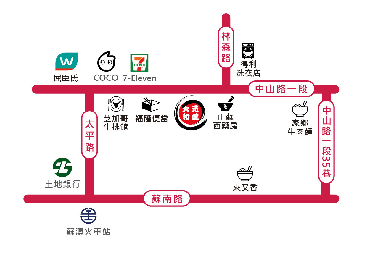 經蘇澳火車站出來後直行至中山路一段右轉步行約7分鐘