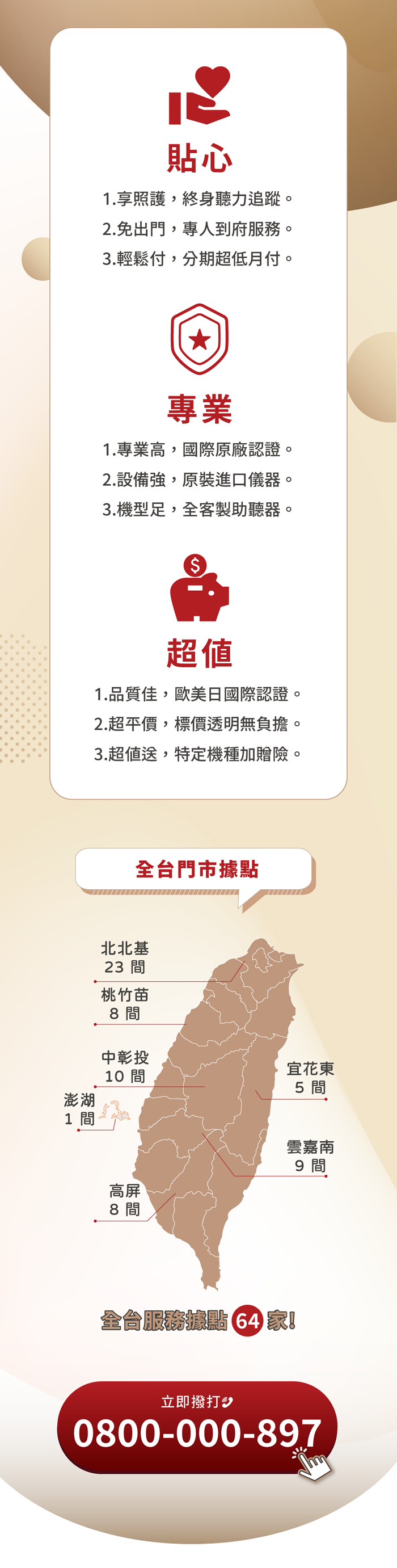 回饋鄉親提供銀髮族享受高品質、高功能性但卻平價的助聽器,重拾聆聽的幸福,是我們的經營理念。