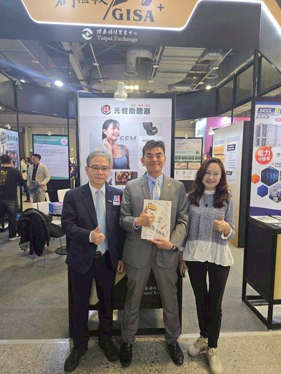 元勛國際公司董事長吳志賢博士(中)與證券櫃買中心新創發展部組長何藹然(右)、證券櫃買中心新創發展部經理王耀華(左)於展會攤位合影。 元健大和/提供